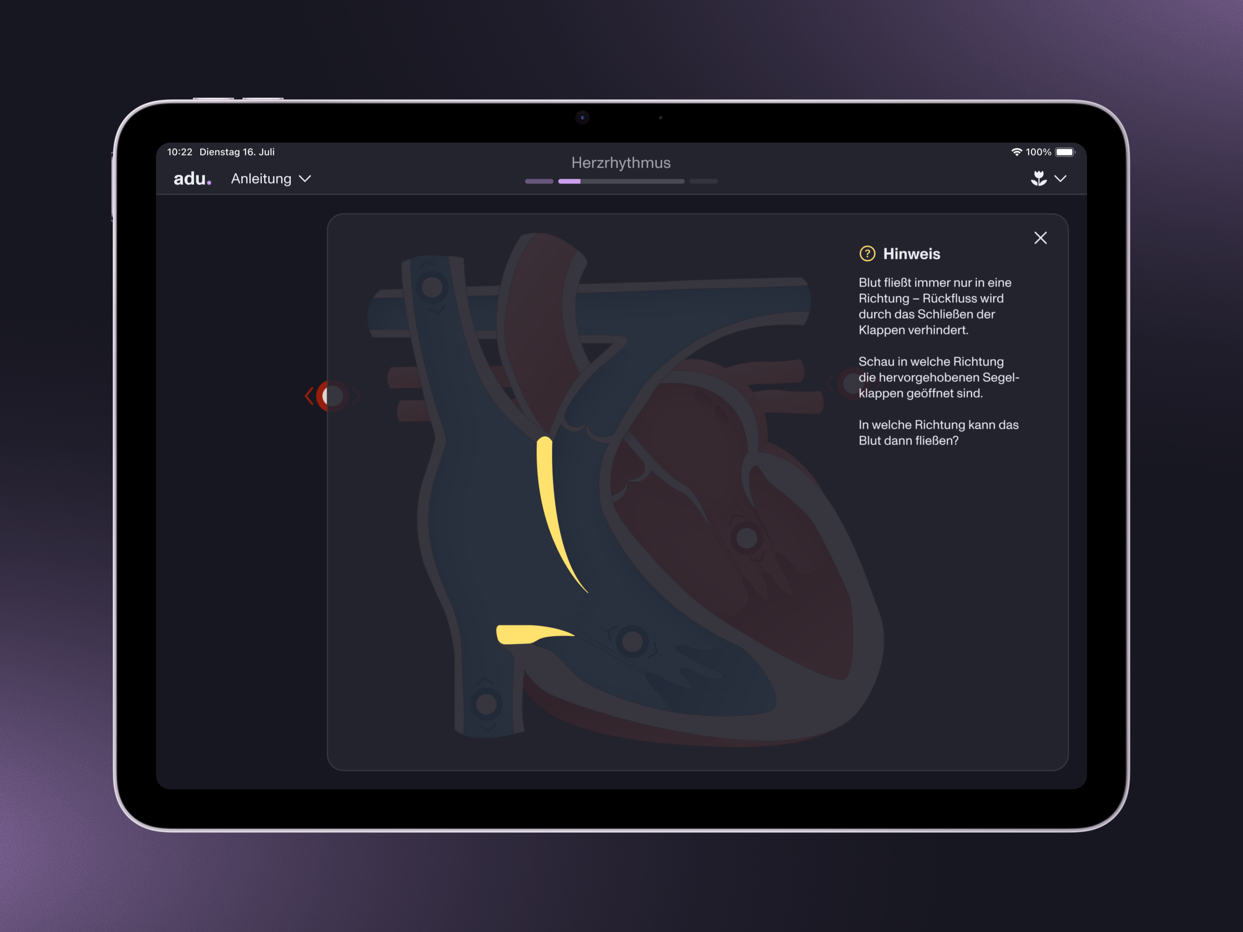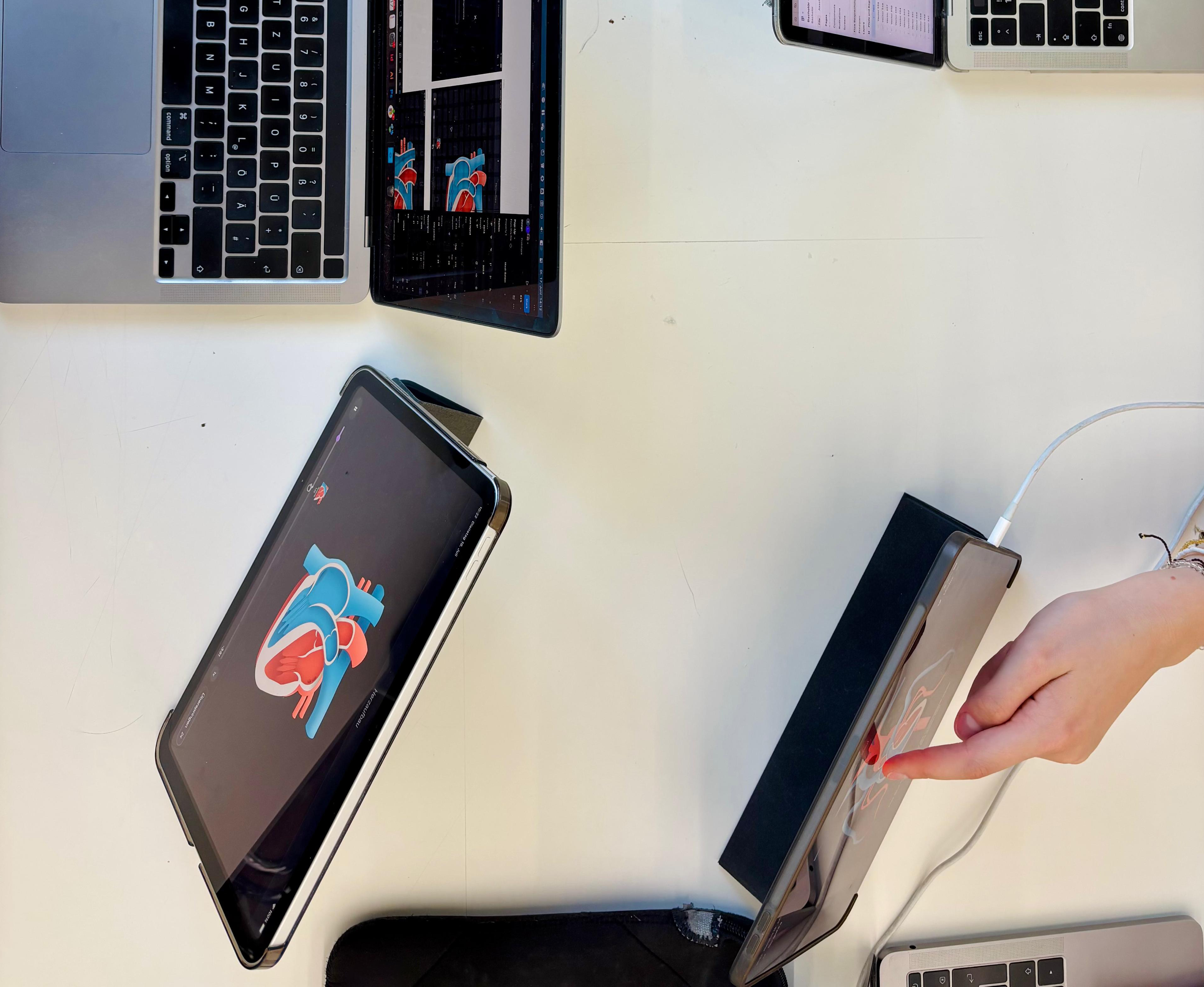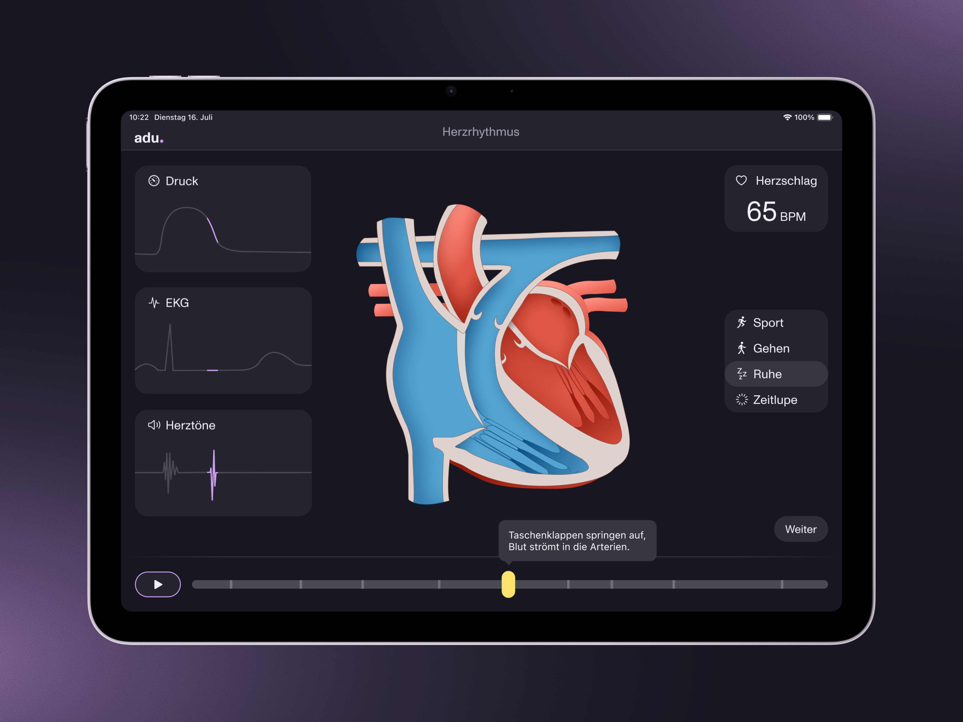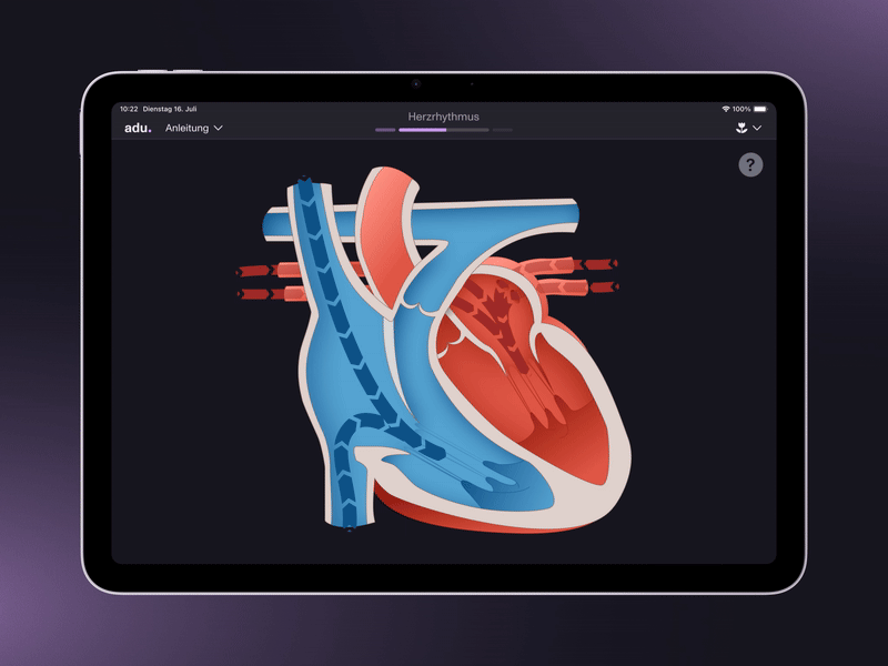 Die selbststeuerbare Animation soll den Lernenden ermöglichen, den Herzzyklus aktiv zu steuern und dabei gleichzeitig Druckkurve, EKG-Signal und Herztöne in Echtzeit nachzuvollziehen. Die Werte für Druck, EKG und Herztöne werden angezeigt und laufen parallel zu dem pumpenden Herz. Das Menü mit den Einstellungen „Sport“, „Gehen“, „Ruhe“ und „Zeitlupe“ soll die Schnelligkeit anzeigen, die ausgesucht werden kann. Wird diese umgestellt, passt sich die Schnelligkeit den pumpenden Herzens an.