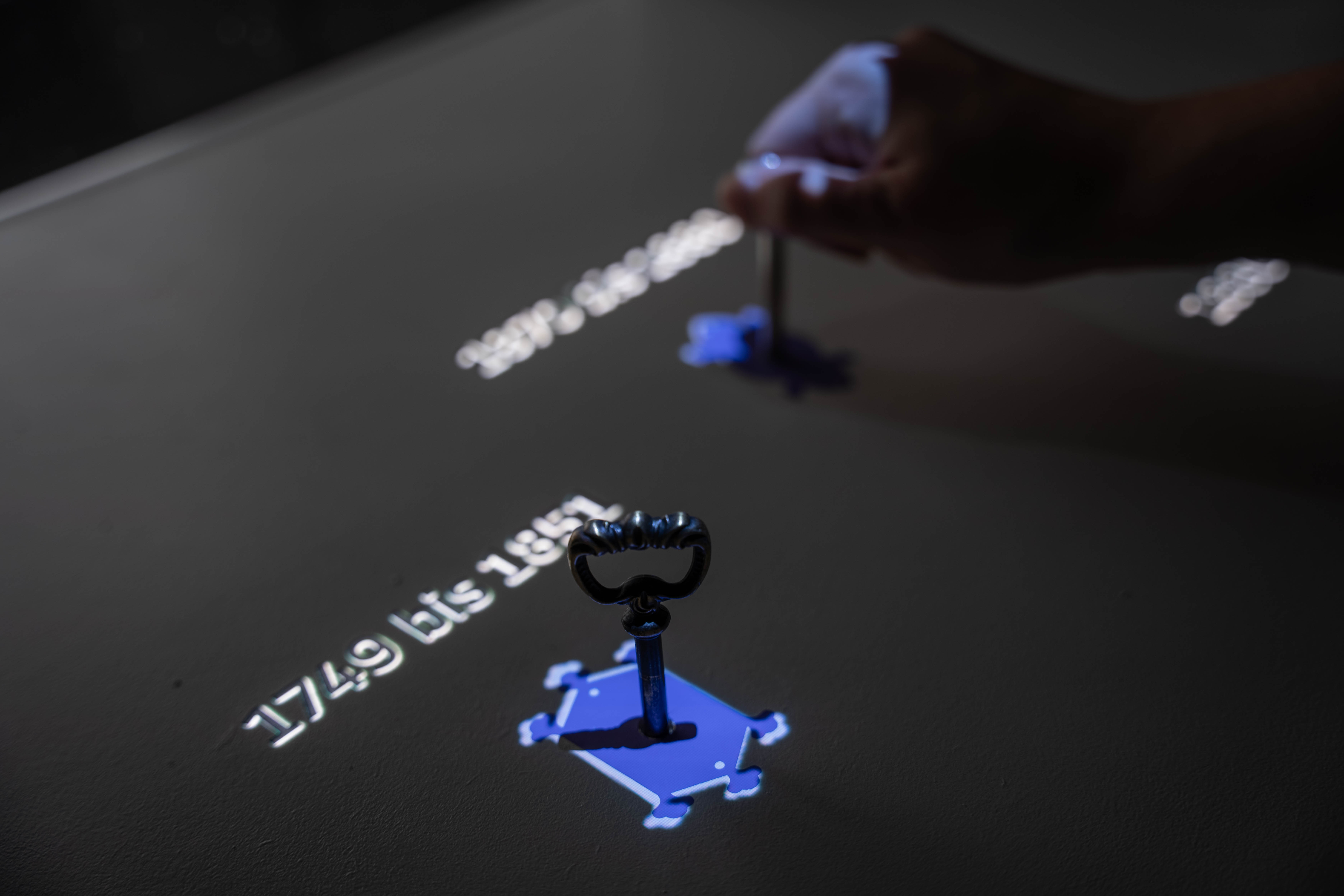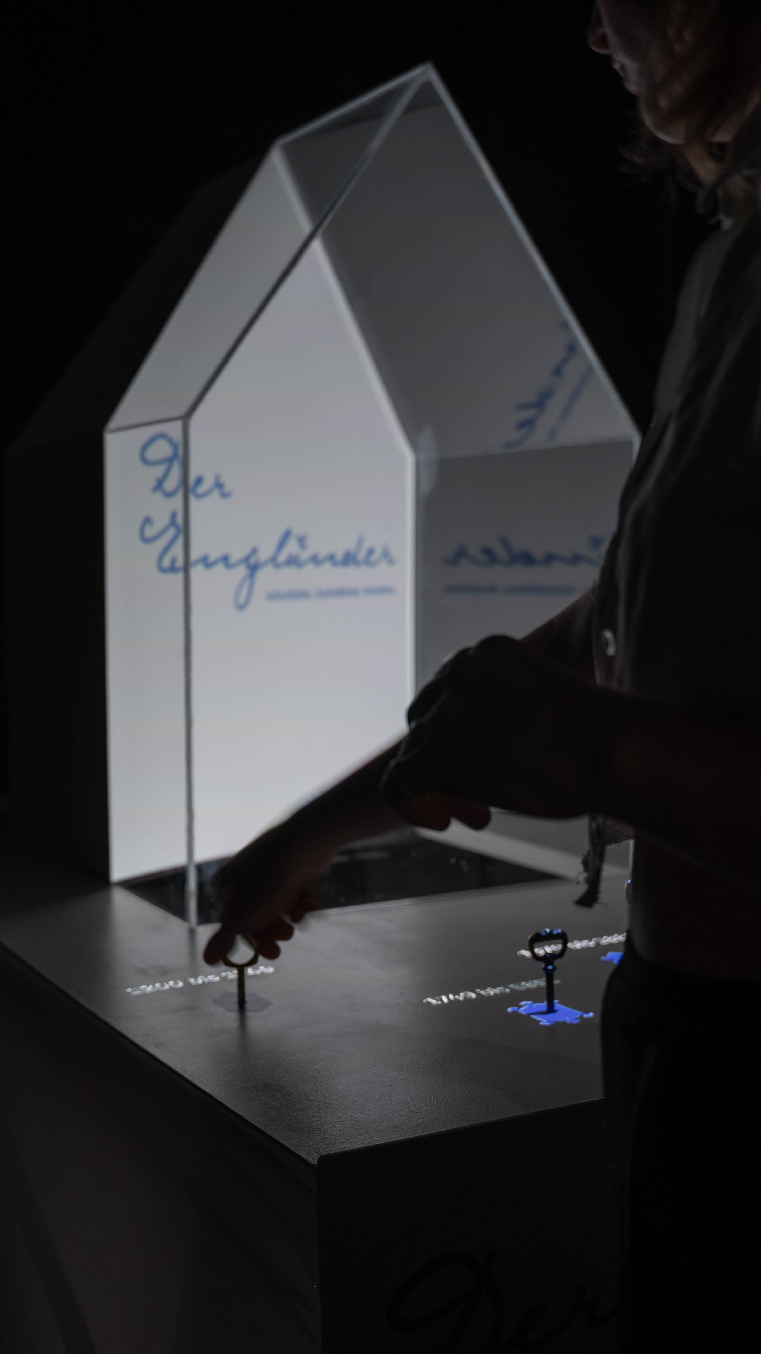 Vor dem Modell befinden sich vier Kastenschlösser. Jeder dieser Schlüssel aktiviert eines von vier Kapiteln aus der Geschichte des Hauses. Dreht man einen Schlüssel, wird dieser beleuchtet, und auf der rechten Seite erscheint ein passender Informationstext zum jeweiligen Kapitel.