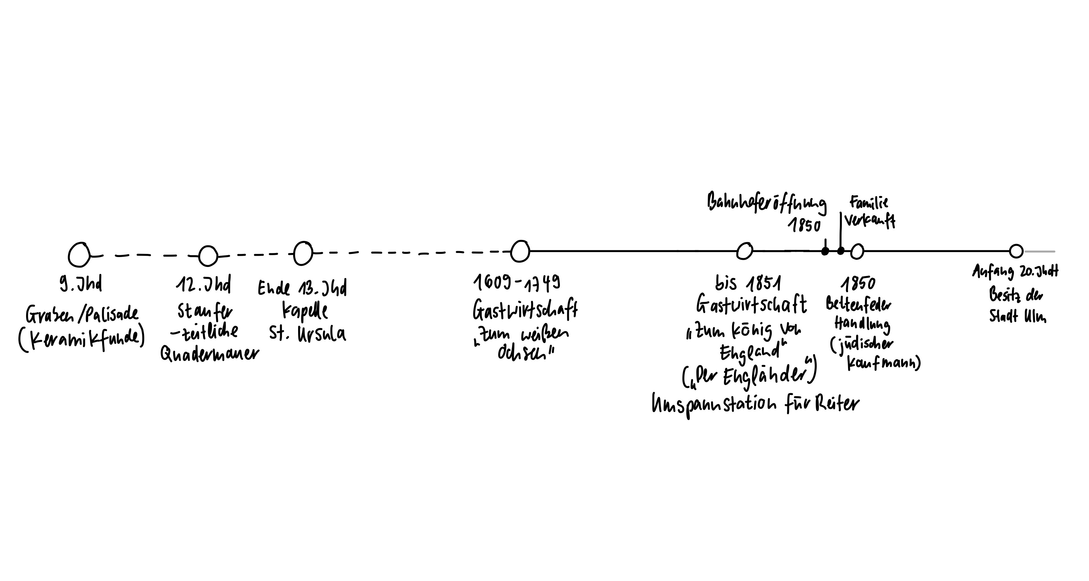 Zunächst thematisieren wir die Ulmer Stadtmauer, eine früher dort liegende Kapelle und schließlich das ursprüngliche Gebäude an diesem Ort – das Gasthaus „Zum weißen Ochsen“.