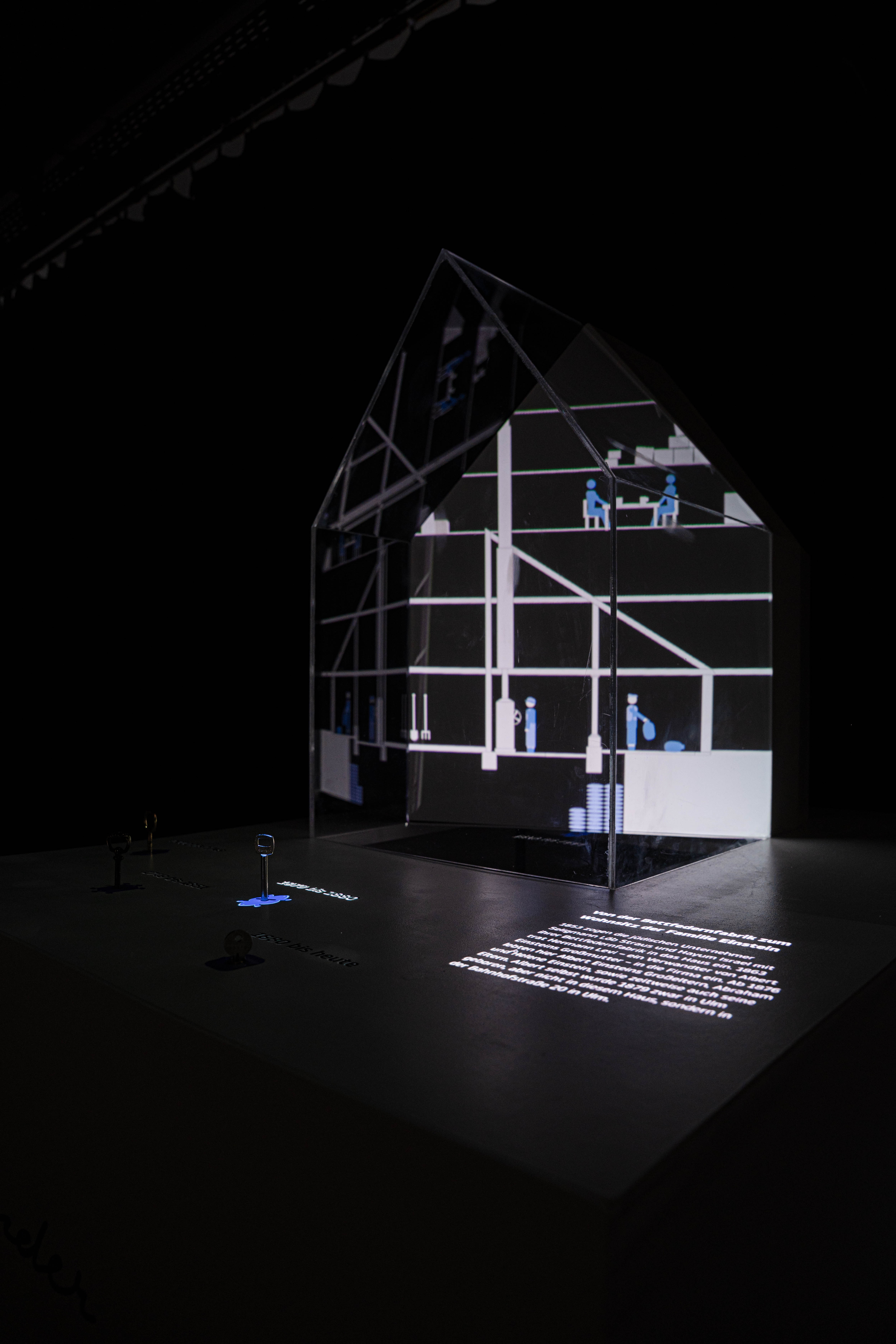 Wir haben das Haus nachgebaut – das Modell ist etwa einen Meter hoch und besteht aus zwei Teilen: Der vordere Bereich ist aus Plexiglas gefertigt und soll so Einblick ins Innere gewähren, der hintere Teil ist aus Holz und dient als Projektionsfläche für eine Animation, die von unten auf das Modell gestrahlt wird. Zusätzlich wird auch von oben mit einem Beamer auf den Tisch projiziert, auf dem das Modell steht.