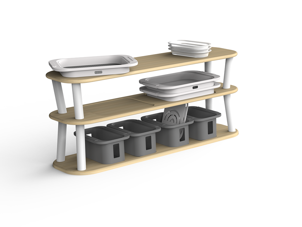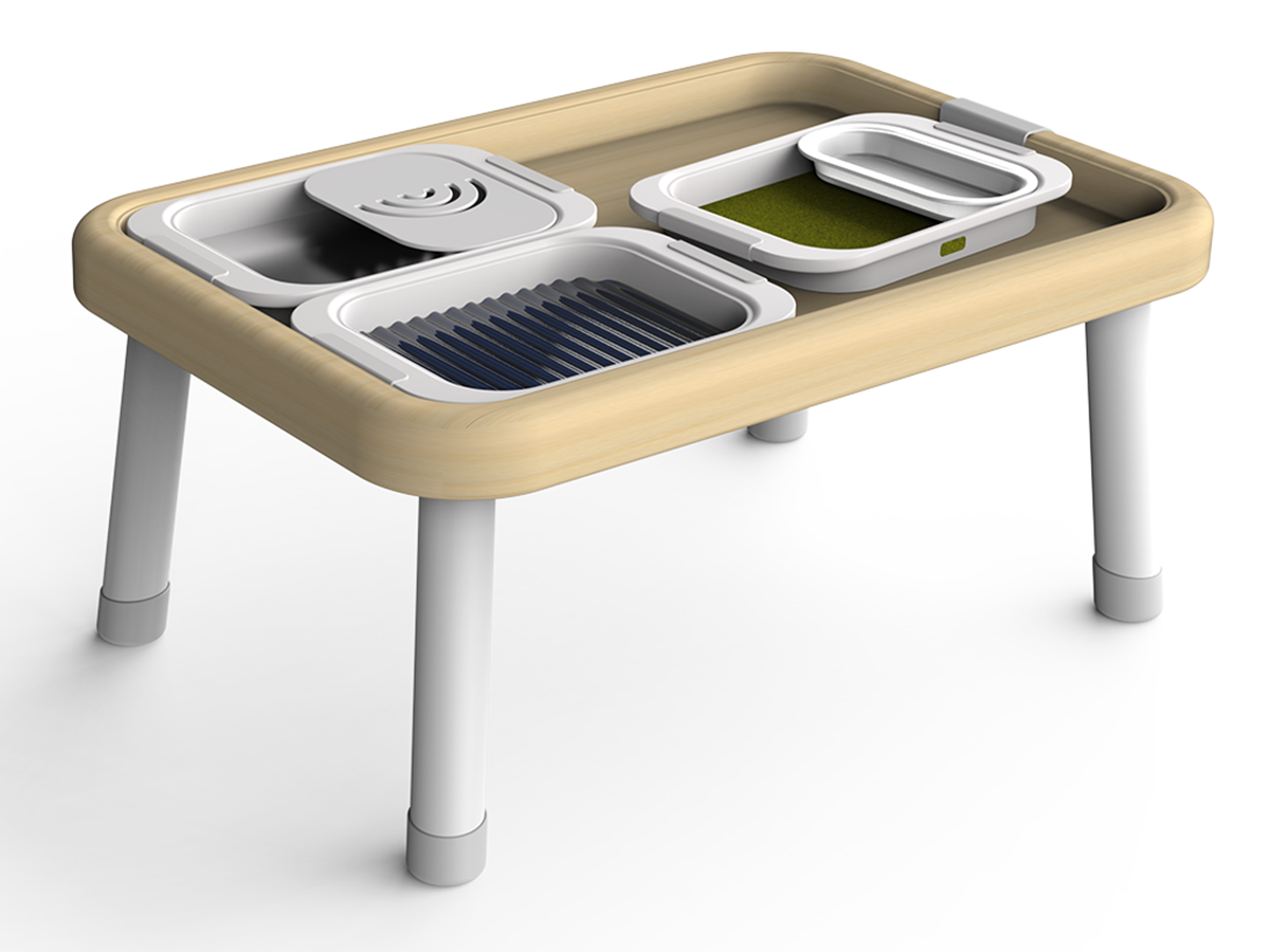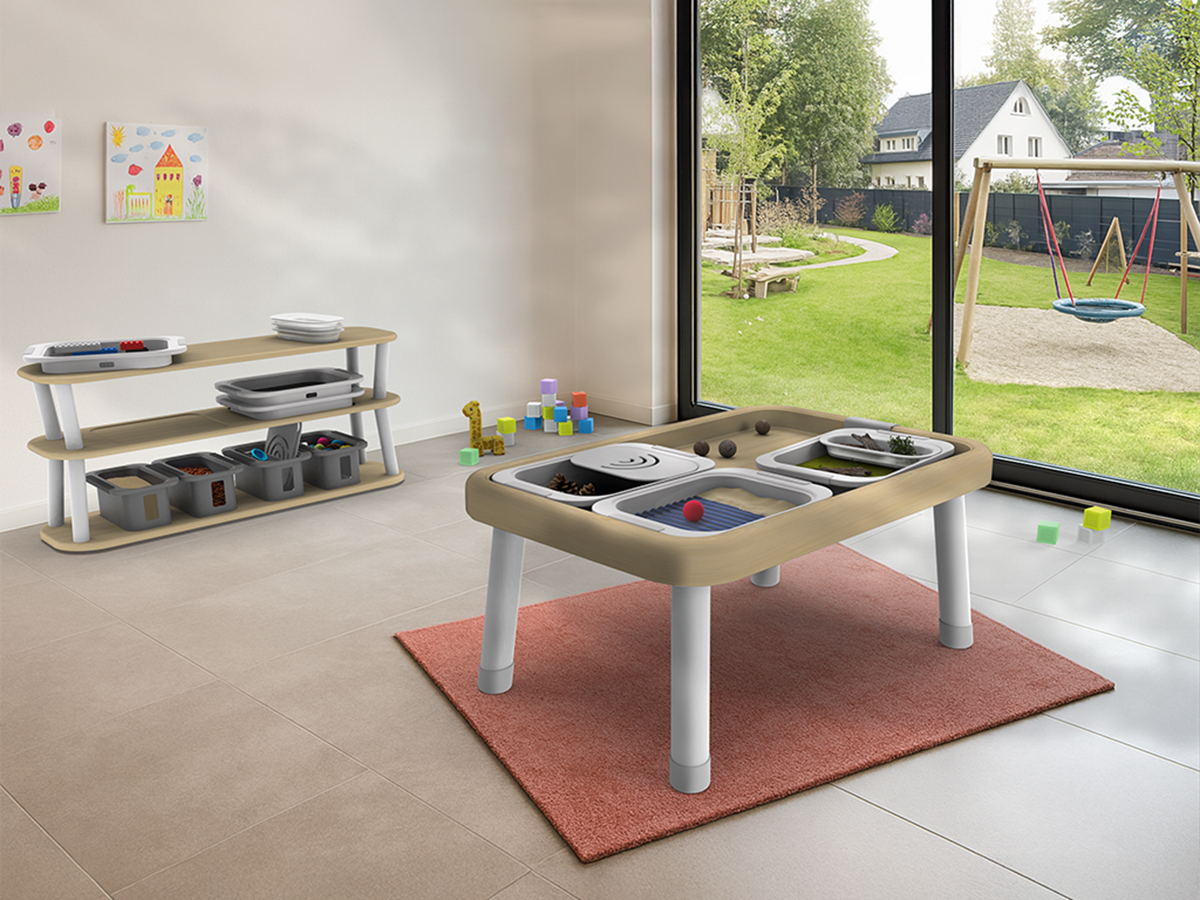 Wir haben mit dem Sensoriksystem Sensu ein bespielbares Tischsystem für Kindergärten entwickelt. Es lädt Kinder zum freien, entdeckenden und kooperativen Spiel ein. Ziel dabei ist es, motorische, kognitive und soziale Kompetenzen zu fördern. Im Fokus steht die Förderung kindlicher Selbstständigkeit. Kinder passen den Tisch selbst an, wählen Materialien aus und gestalten ihre Spielsituation eigenständig. Diese aktive Nutzung ist das zentrale Alleinstellungsmerkmal unseres Sensoriksystems. Es entlastet pädagogische Fachkräfte im Alltag und bietet ein Konzept, das es in dieser Form bislang nicht auf dem Markt gibt. Somit reagieren wir mit dem Projekt auf zwei zentrale Herausforderungen des aktuellen und zukünftigen Alltags in Kindergärten: dem steigenden Fachkräftemangel und der fortschreitendenden Abnahme aktiver, sinnlicher Spiel- und Lernformen durch digitale Medien. Um das zu ermöglichen, haben wir einen von allen Seiten bespielbaren Tisch gestaltet, der mit wechselbaren Tabletts ausgestattet ist. Diese bieten vielfältige Oberflächen wie Moos, Spiegel oder Sand und lassen sich individuell kombinieren. Ergänzt wird das System durch ein offenes Materiallager, Aufgabenplatten und Inlays. Alle Elemente sind intuitiv nutzbar und auf kindgerechter Höhe positioniert. Im Rahmen unserer Bachelorarbeit haben wir unser Möbel im Kindergarten getestet. Sowohl die Kinder als auch die Fachkräfte gaben uns durchweg positives Feedback. Besonders gelobt wurden die klare Gestaltung, die hohe Flexibilität und die einfache Handhabung. Das Sensoriksystem Sensu vereint Gestaltung und Pädagogik in einem modularen Möbel.
