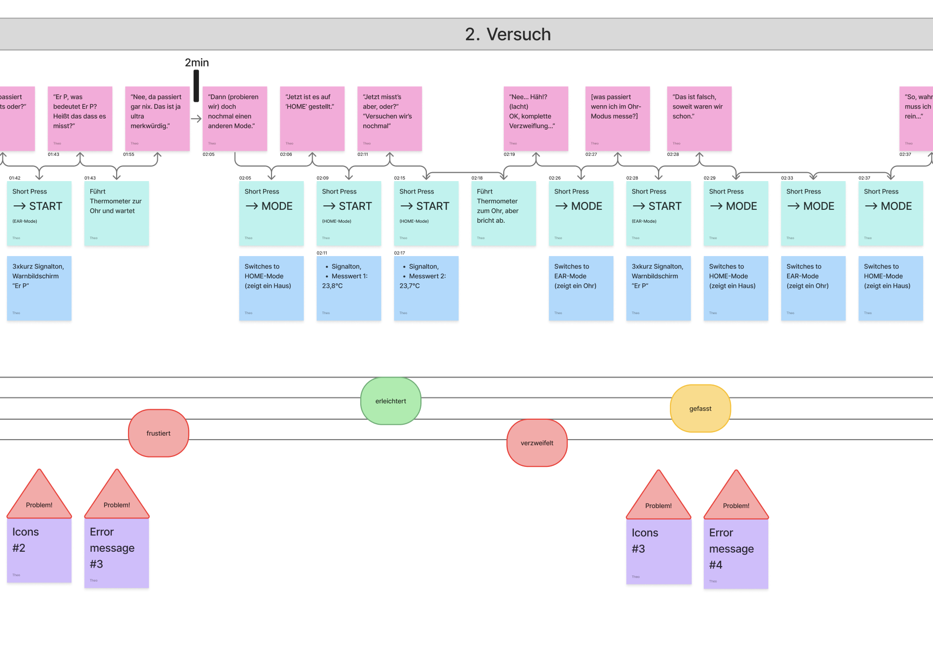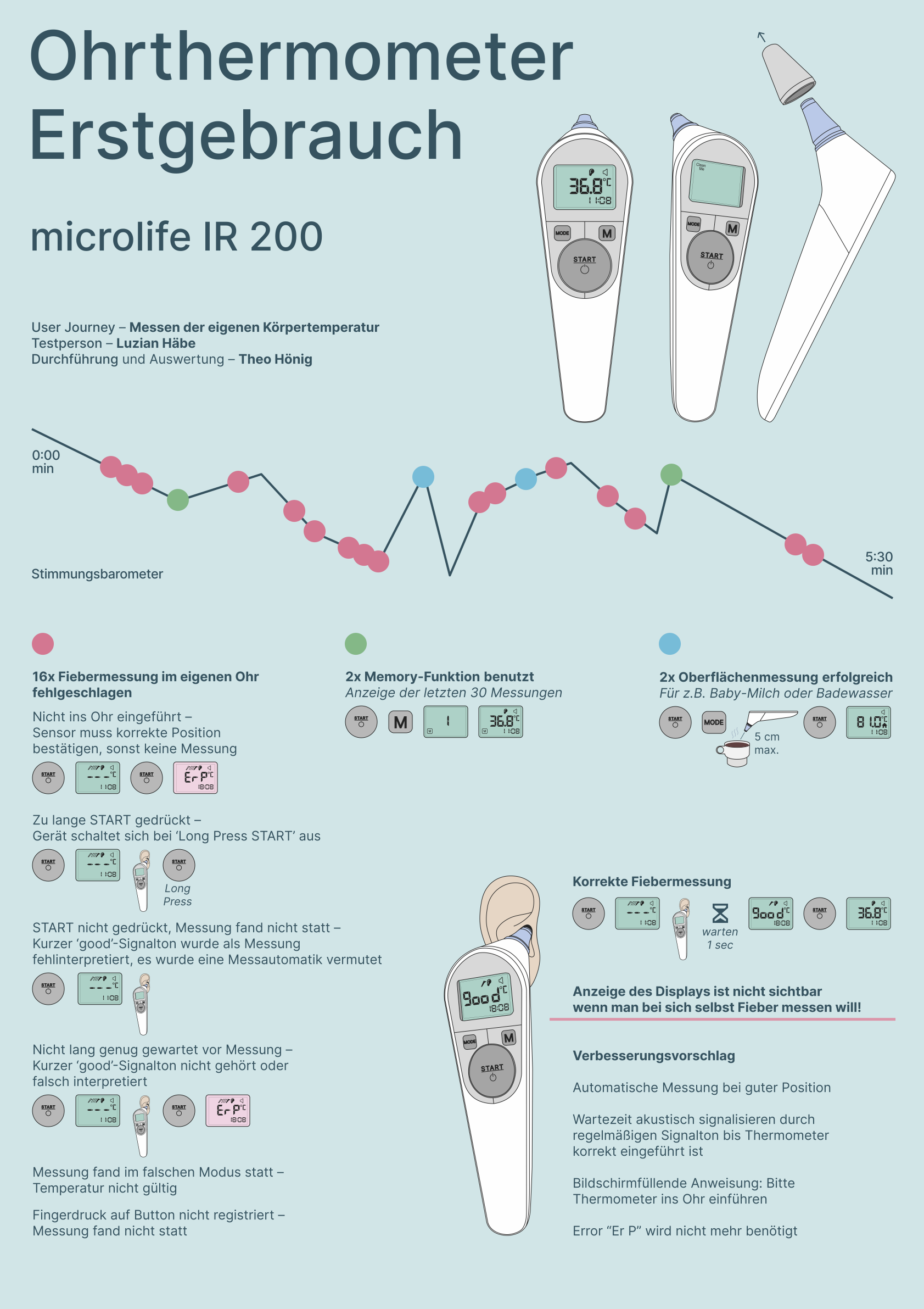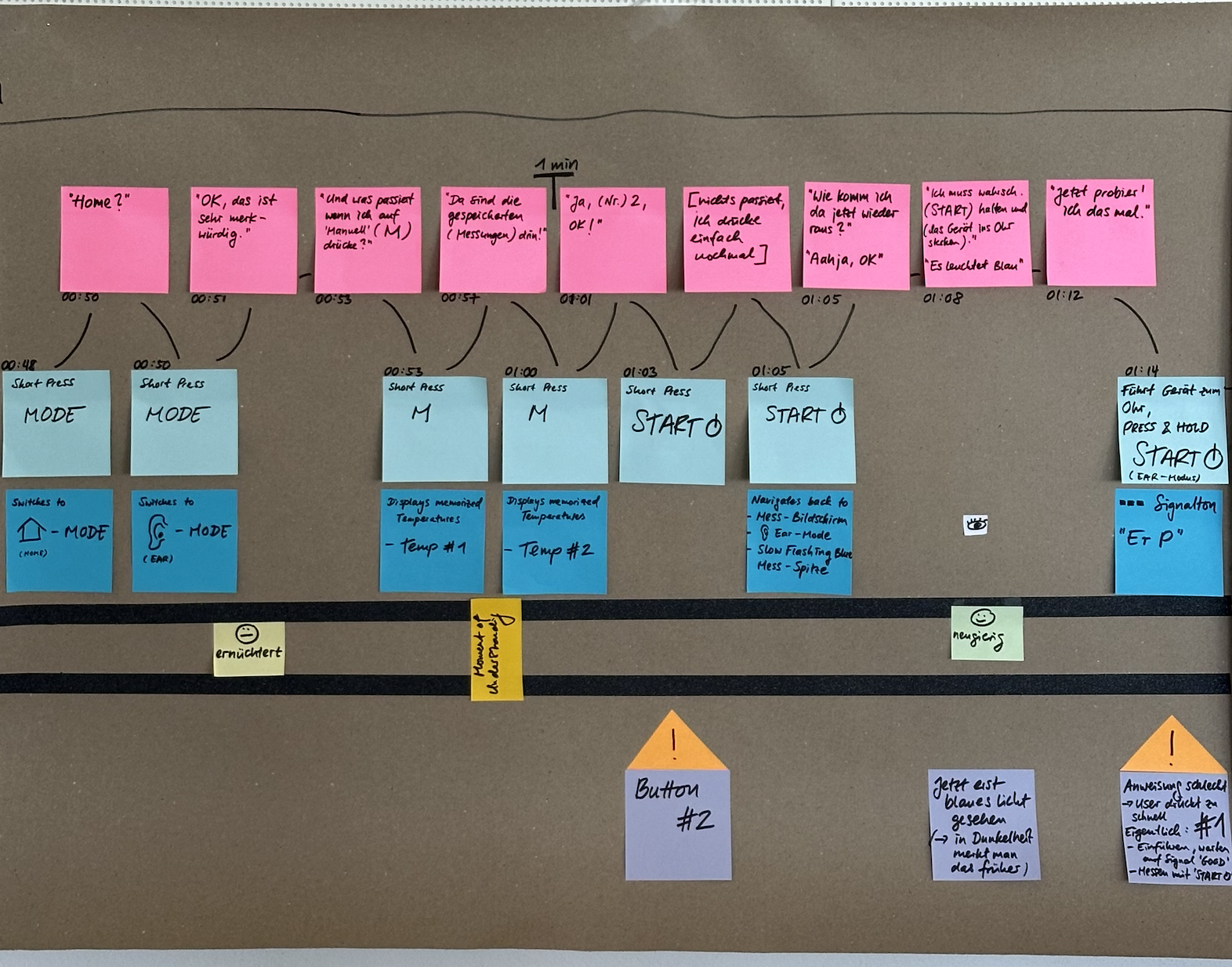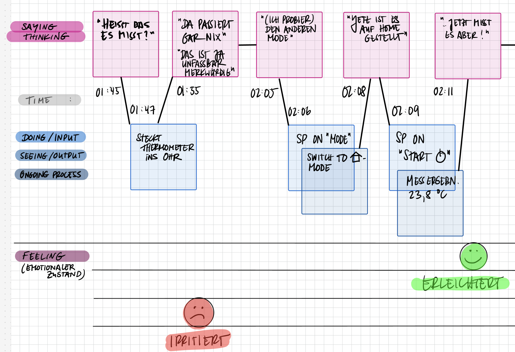 Die Testperson erhielt das Ohrthermometer microlife IR 200 mit der Aufgabe: “Miss deine eigene Körpertemperatur.” Ohne Anleitung wurde die Nutzung aus zwei Perspektiven gefilmt (Totale und Detail). Anschließend wurde die Interaktion analysiert und mithilfe von Post-it’s an einer Pinnwand festgehalten.