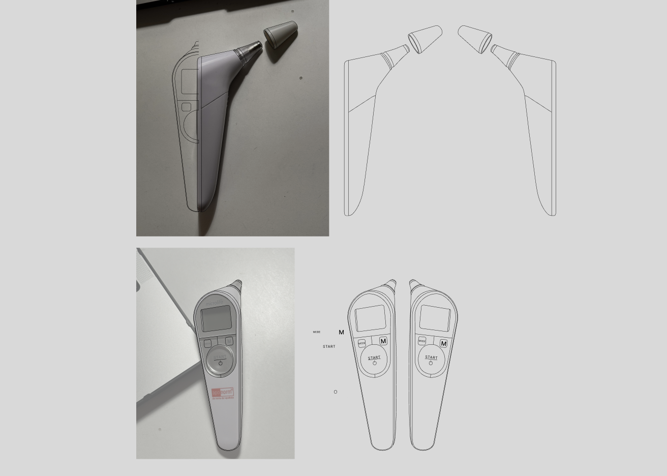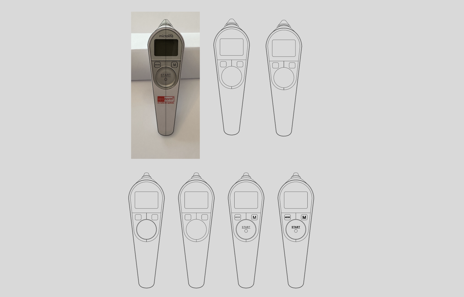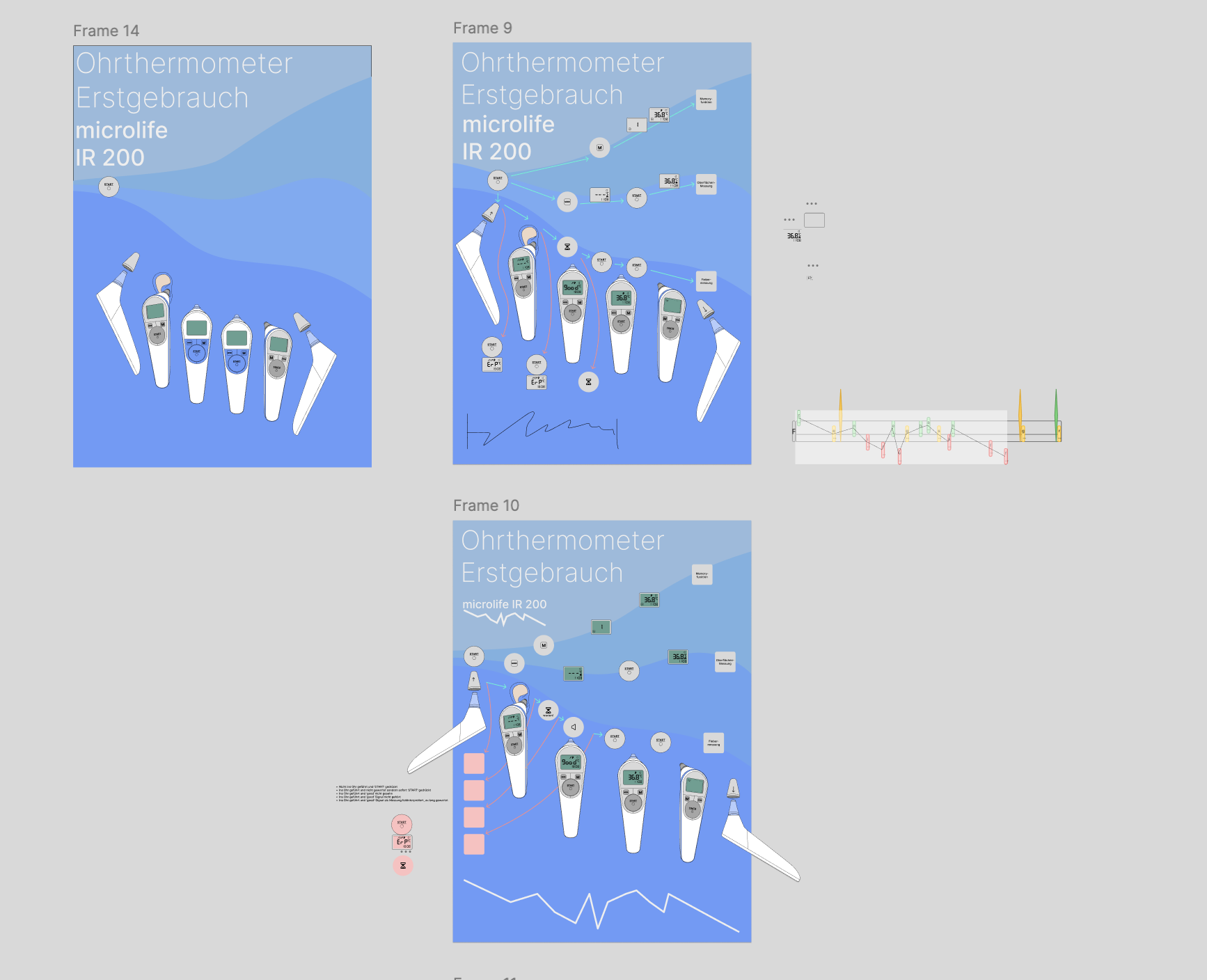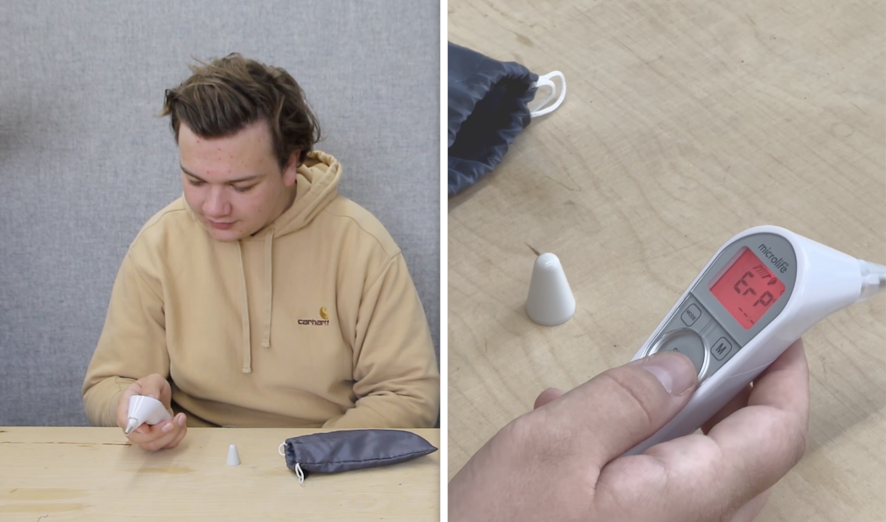 Die Testperson erhielt das Ohrthermometer microlife IR 200 mit der Aufgabe: “Miss deine eigene Körpertemperatur.” Ohne Anleitung wurde die Nutzung aus zwei Perspektiven gefilmt (Totale und Detail). Anschließend wurde die Interaktion analysiert und mithilfe von Post-it’s an einer Pinnwand festgehalten.